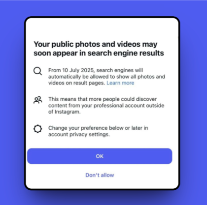 Instagram now (by default) allows search engines like Google to display public images and videos from professional Instagram accounts, making them visible without the need to log in. Creators are able to opt out, however it will be automatically set to ‘on’.